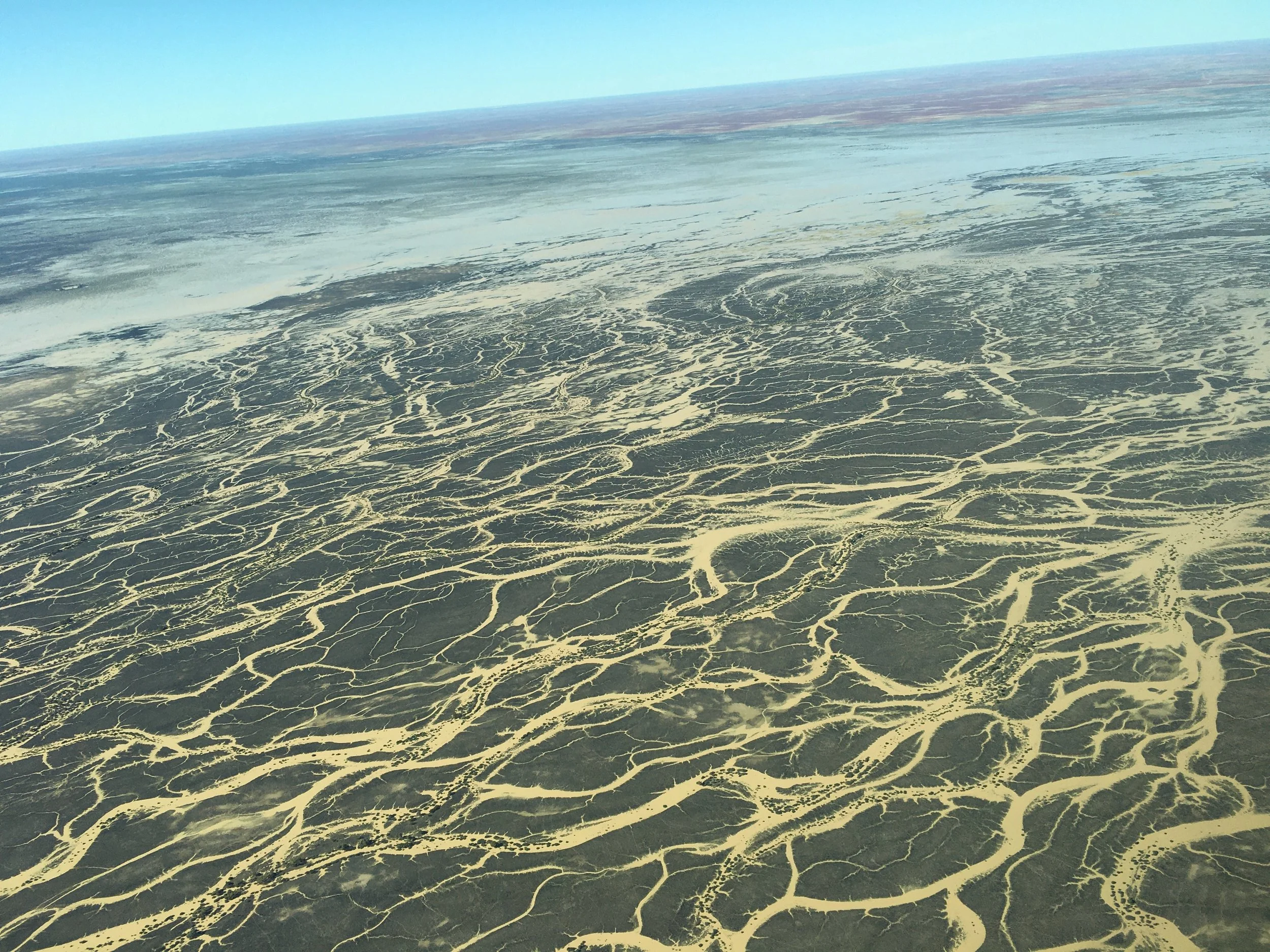 The two-day flight started at the Hawker airfield. We flew north, did a loop over Wilpena Pound, then continued up the eastern side of the Flinders, over the Vulkathunha-Gammon Range to Arkaroola; further north over the Strzelecki desert, to Innamincka where we stopped for lunch (at the pub). The Cooper Creek was in flood and impassable. After lunch, a short flight out for a quick look at the Burke and Wills Dig Tree, then back aloft to Birdsville for an overnight stay (at the Birdsville Hotel, a wonderful place). Next morning, we flew across ‘Big Red’ (a huge sand dune in the Simpson desert), then followed the course of the Diamantina River south-east to where it fanned out into the Goyder Lagoon, then re-formed as the Warburton River en route to northern Lake Eyre. There was a lot of water around, from the rainfall back in February. More recent rains were also swelling the water courses, and we could see the front of the newer water. Quite spectacular, lots of birds. Then we were over Lake Eyre North, then the southern part, before stopping for lunch at Marree. Another interesting old pub. The flight home tooks us over Leigh Creek, and the western side of the Ikara-Flinders Range, another loop over the western end of the Pound, and returning to Hawker.